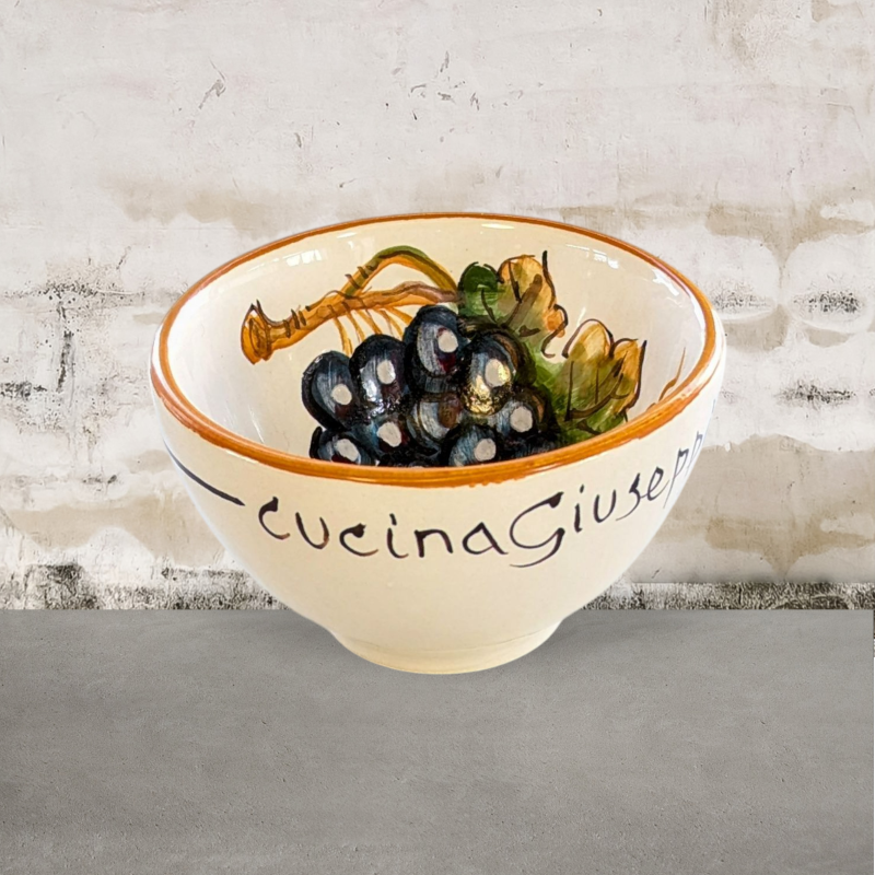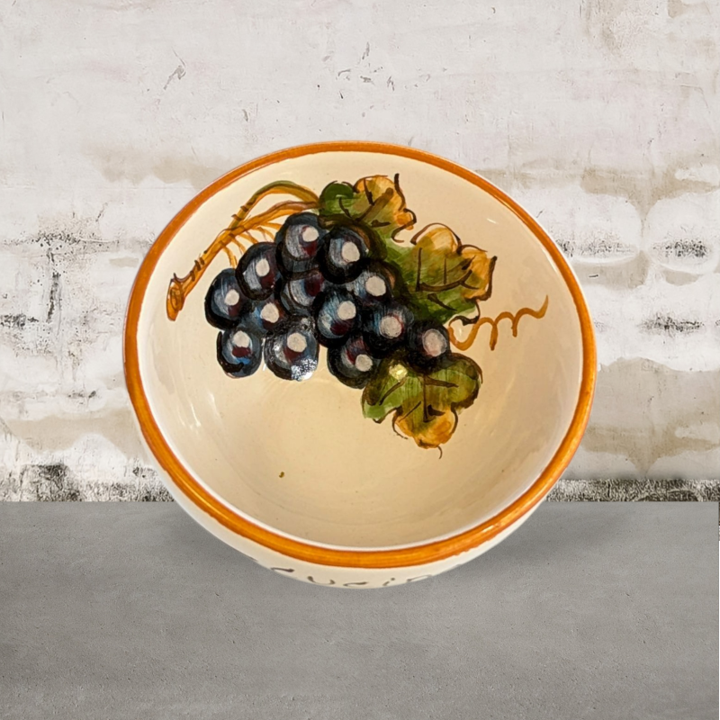 Un comodo ciotolino in ceramica, spicca sugli aperitivi, perfetto per olive e noccioline , si usa in cucina anche per separare gli ingredienti di una ricetta. Su uno sfondo bianco panna è raffigurato un grappolo di sangiovese . Presenta una bordatura gialla ocra.