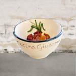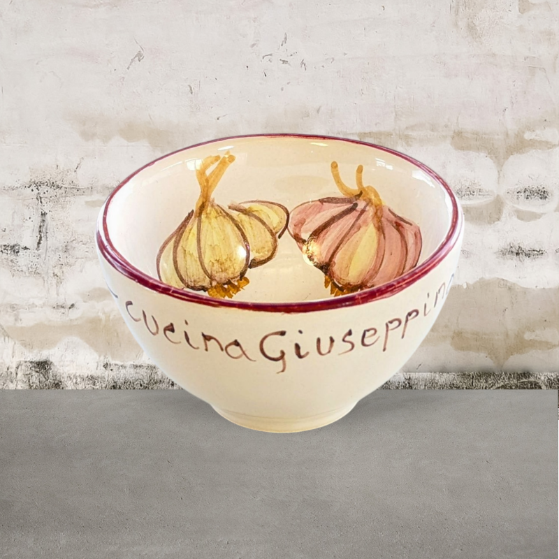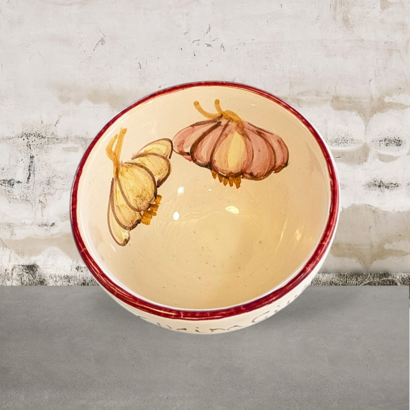 Un comodo ciotolino in ceramica, spicca sugli aperitivi, perfetto per olive e noccioline , si usa in cucina anche per separare gli ingredienti di una ricetta. Su uno sfondo bianco panna è raffigurato un Aglio . Presenta una bordatura rosso vino.