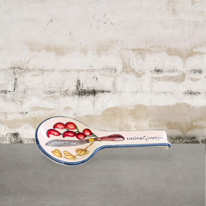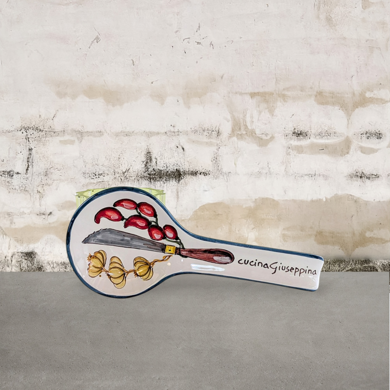 Raffinato Poggiamestolo in stile Toscano , interamente decorato a mano , su sfondo bianco raffigura un coltello centrale con decorazioni di aglio e peperoncino ai lati . Presenta una bordatura blu cobalto.